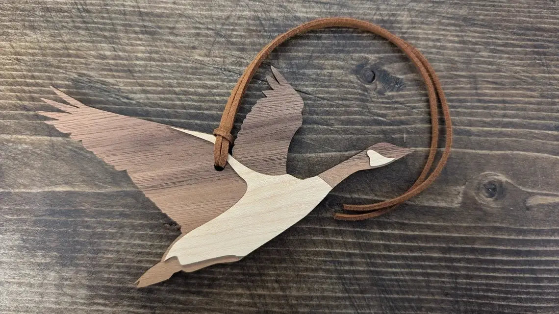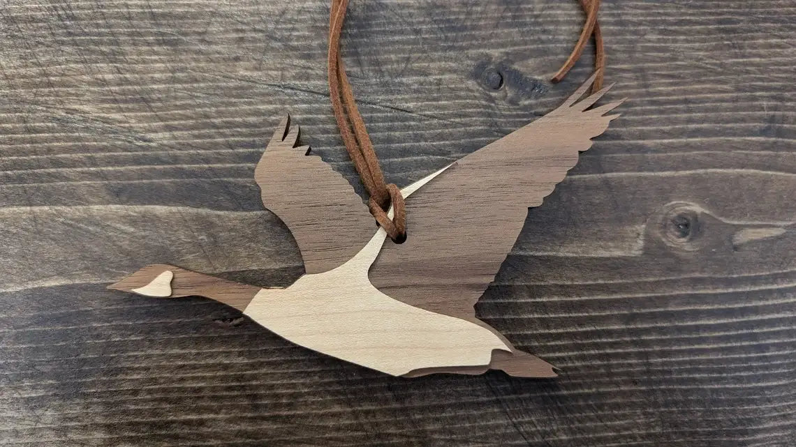 Cut in walnut & maple wood and finished off with a faux leather cord, this iconically Canadian Goose is perfect for hanging on the tree, tied into a wreath, stocking tag, wedding favours or tied onto a gift.