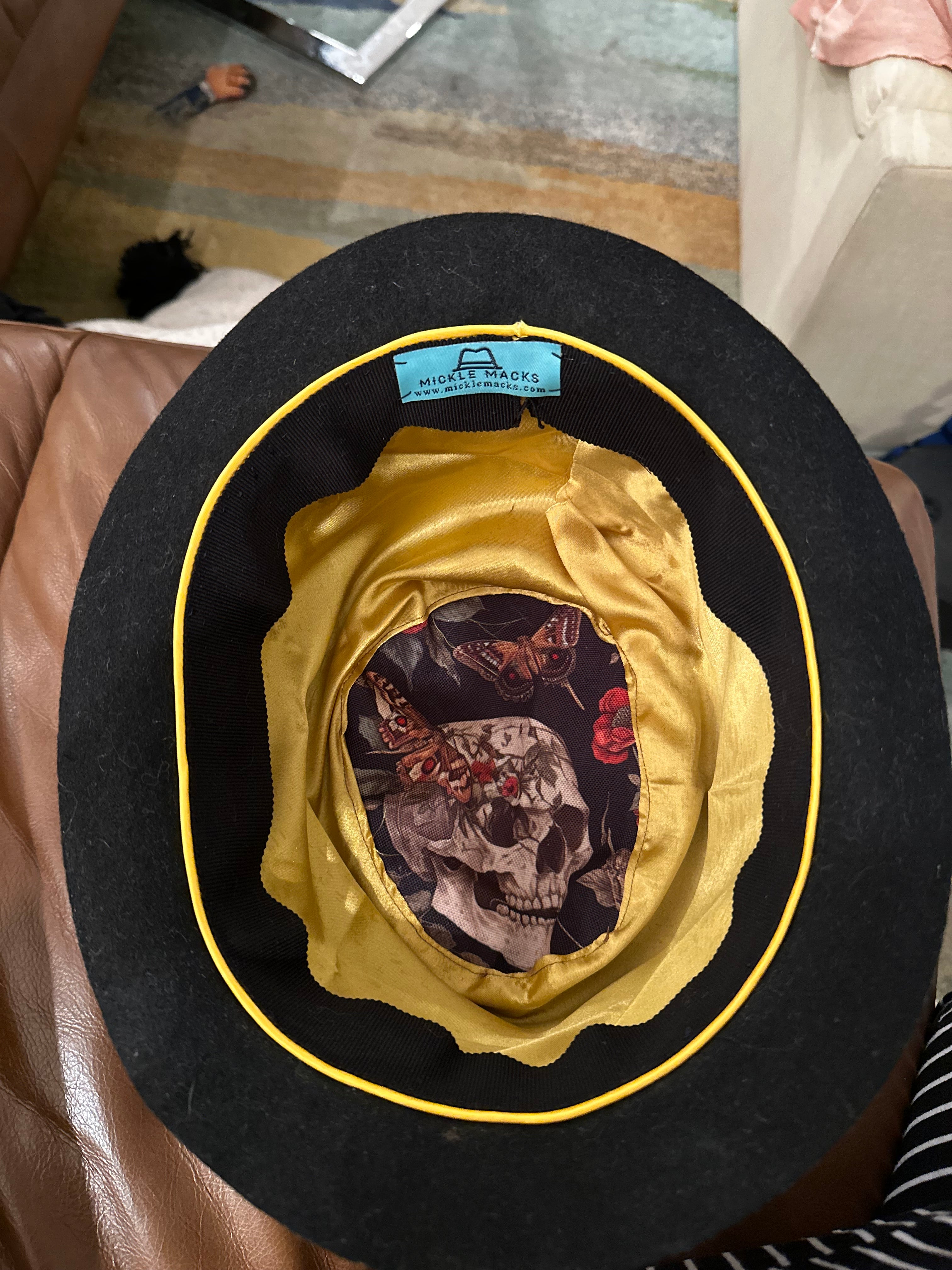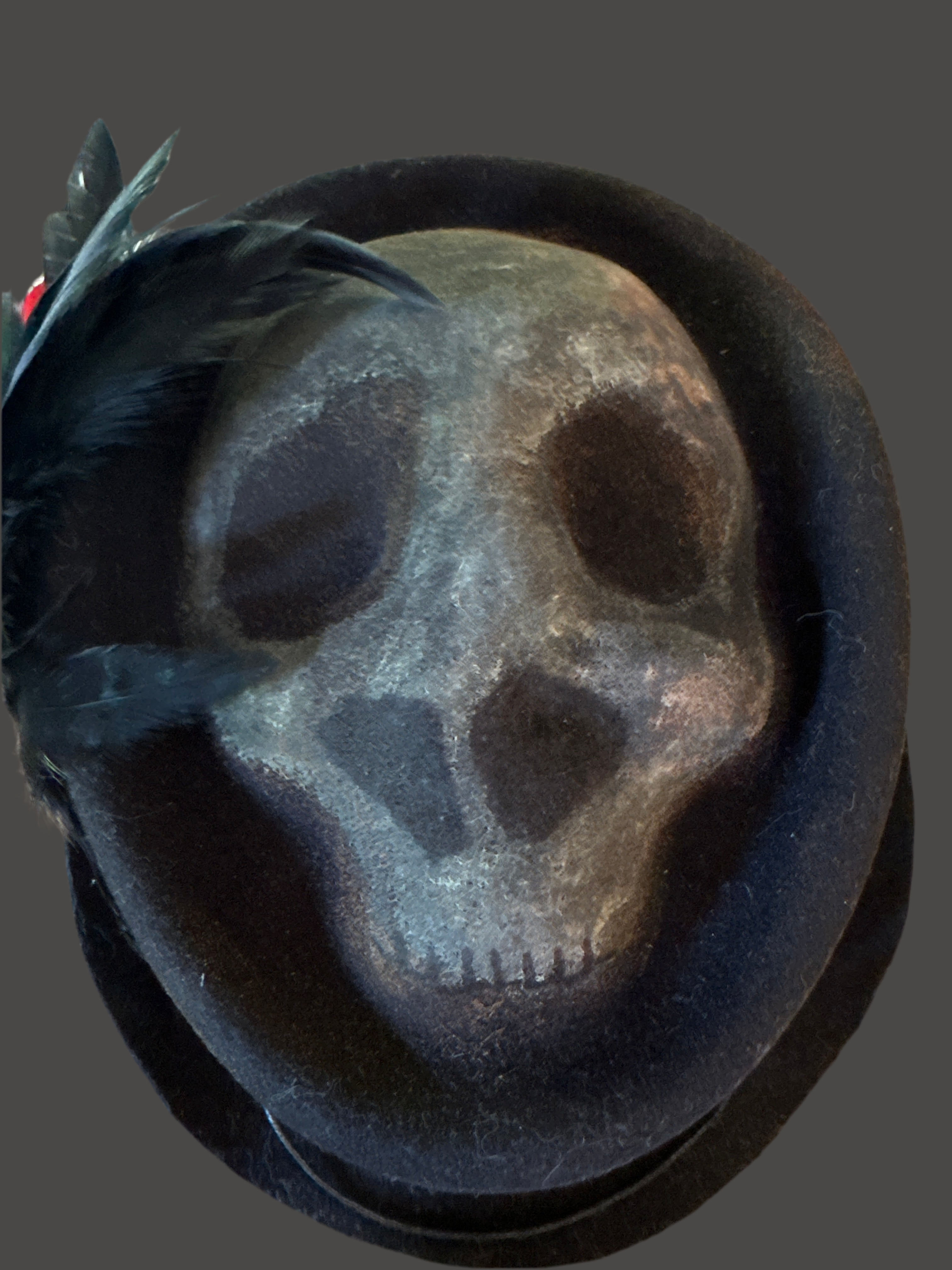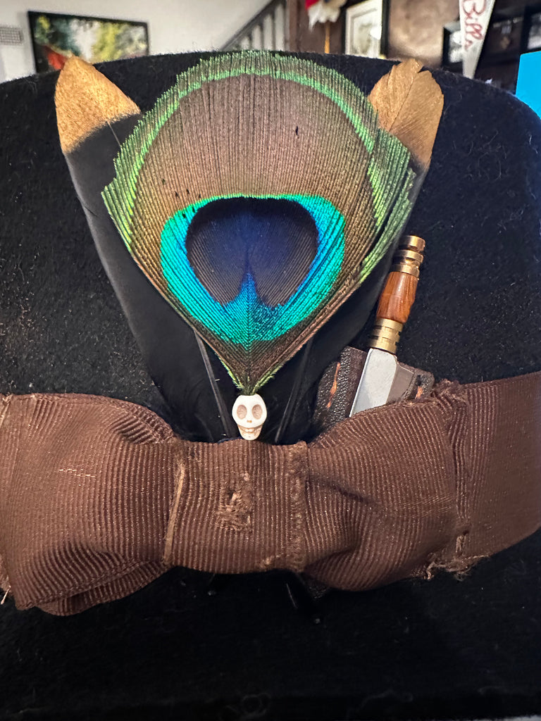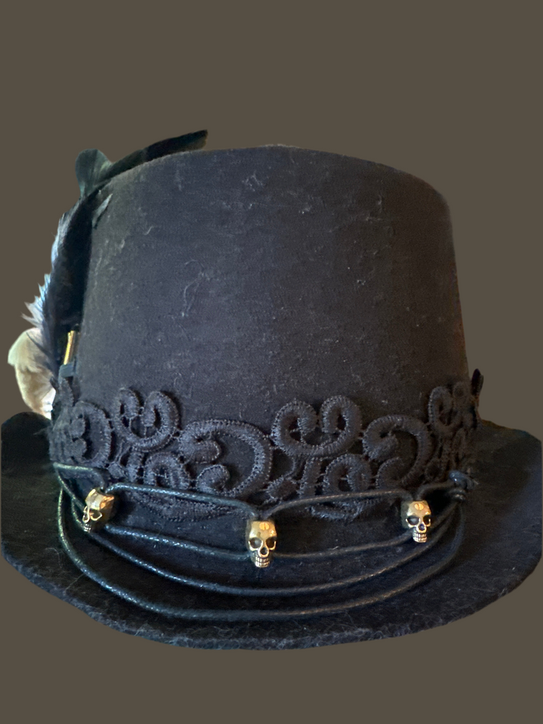 Lead the way in this Steampunk coachman adorned with a painted skull on the crown, large feather hocks, hat pins, gold skull jewellery and bands of lace and leather for women’s or distressed ribbon for men. Choose your weapons and get ready to throw down in this one of a kind top hat.