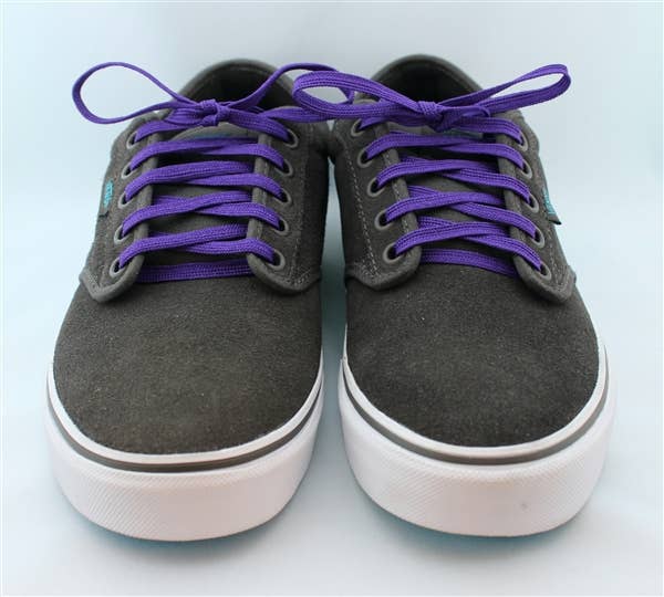 Purple Laces Available in 45”/114cm good for sneaker with 6-7 pairs of eyelets Type: Sneaker Lace Colour: Purple Tip: Silver Material: Colorfast nylon Length: 45"/114cm Pairs of Eyelets: 6 - 7