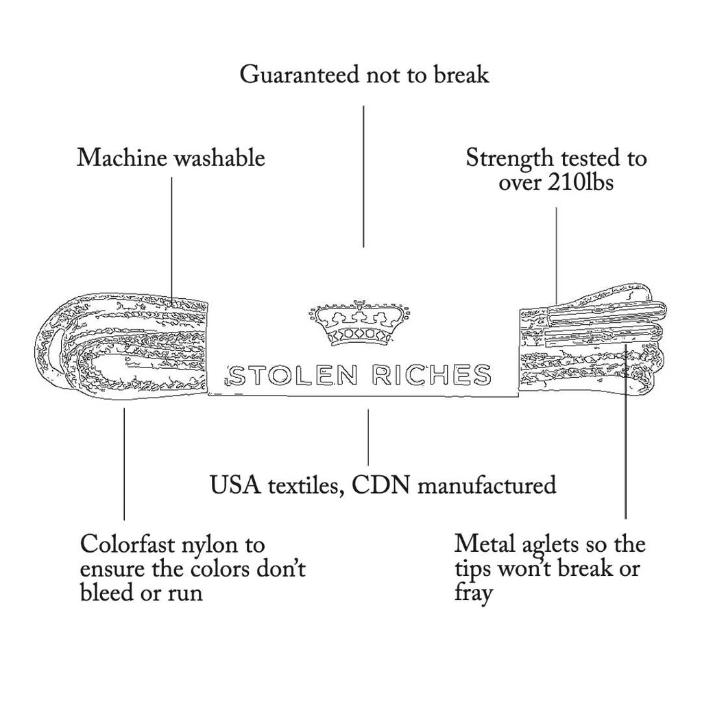 Machine washable Add colour, durability, and Canadian craftsmanship to your store. Stolen Riches boot laces are unisex, machine washable, abrasion-resistant, and backed by a lifetime guarantee. Compact, high-margin accessories that drive impulse sales and add heritage storytelling your customers will love. The Everyday Accessory That Sells Itself Boot laces are a simple detail that can completely refresh a pair of boots — and the perfect add-on accessory for your store. Stolen Riches Colourful Unisex Boot Laces, proudly made in Canada, combine small-batch quality with bold colours and durability your customers will notice. For over 100 years, our family-run Canadian brand has been reimagining everyday accessories with colour, craftsmanship, and story. These laces are