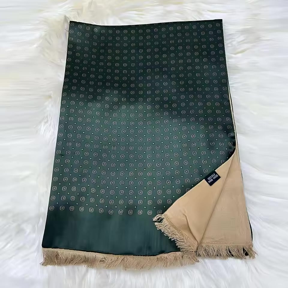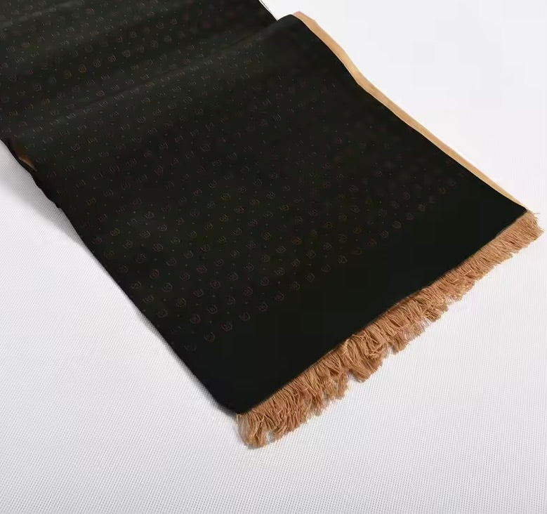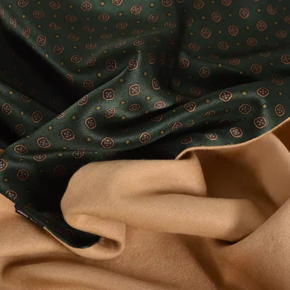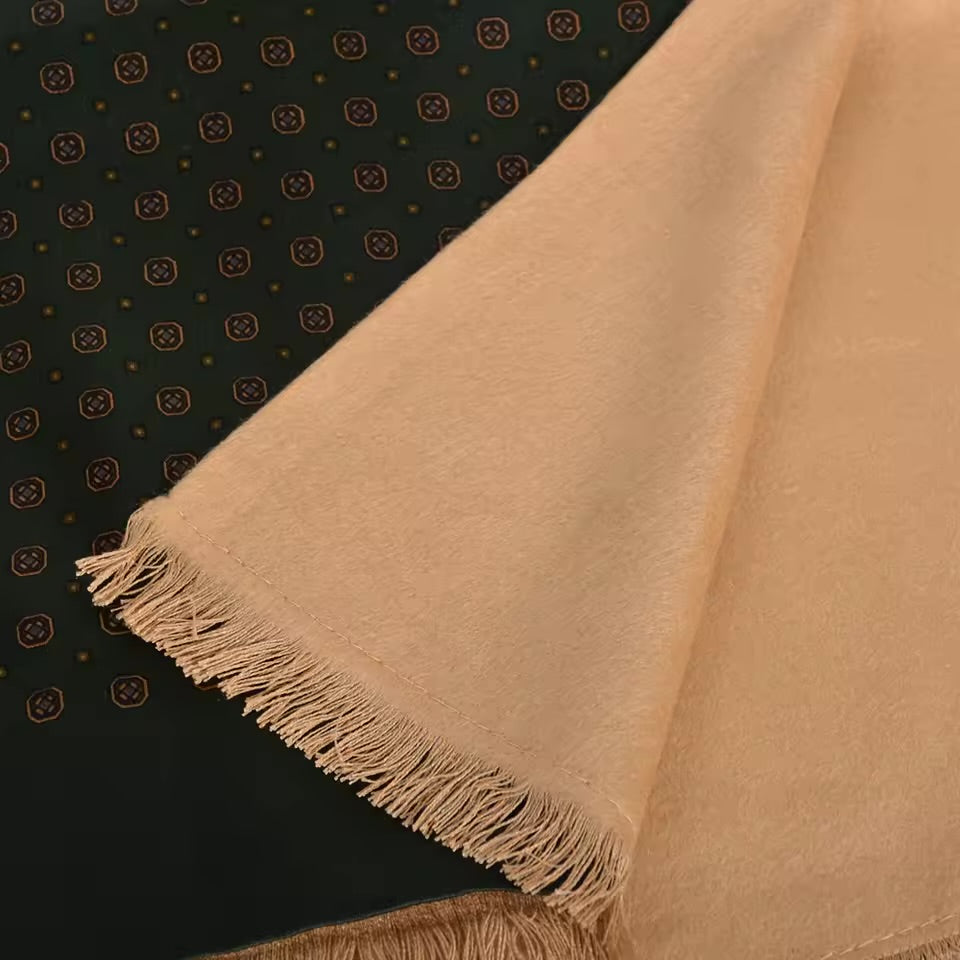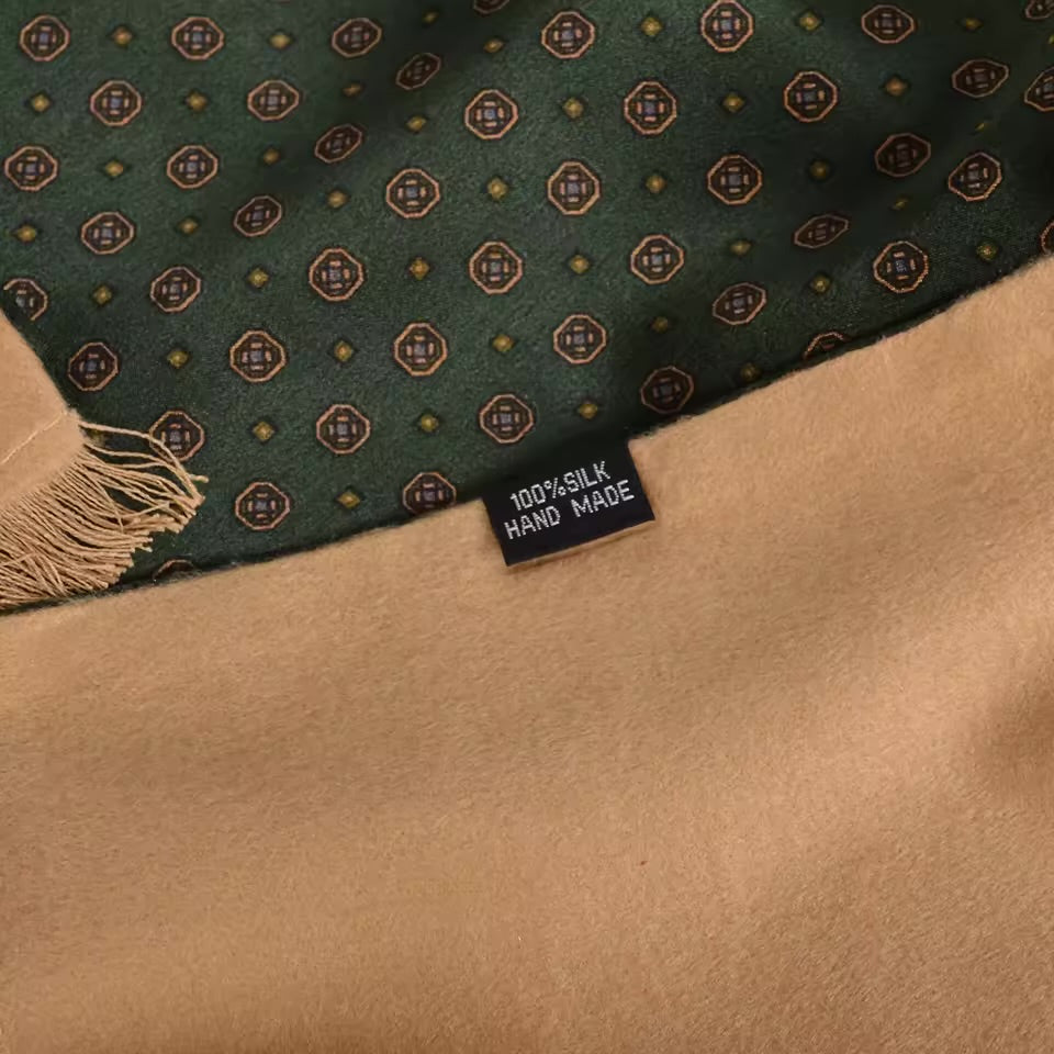 Double Layer of finest silk will make you feel great and look even better! Snazz up that old holiday outfit this year. One side is solid colour velvet knit silk and the other side is satin silk with elegant geometric pattern.