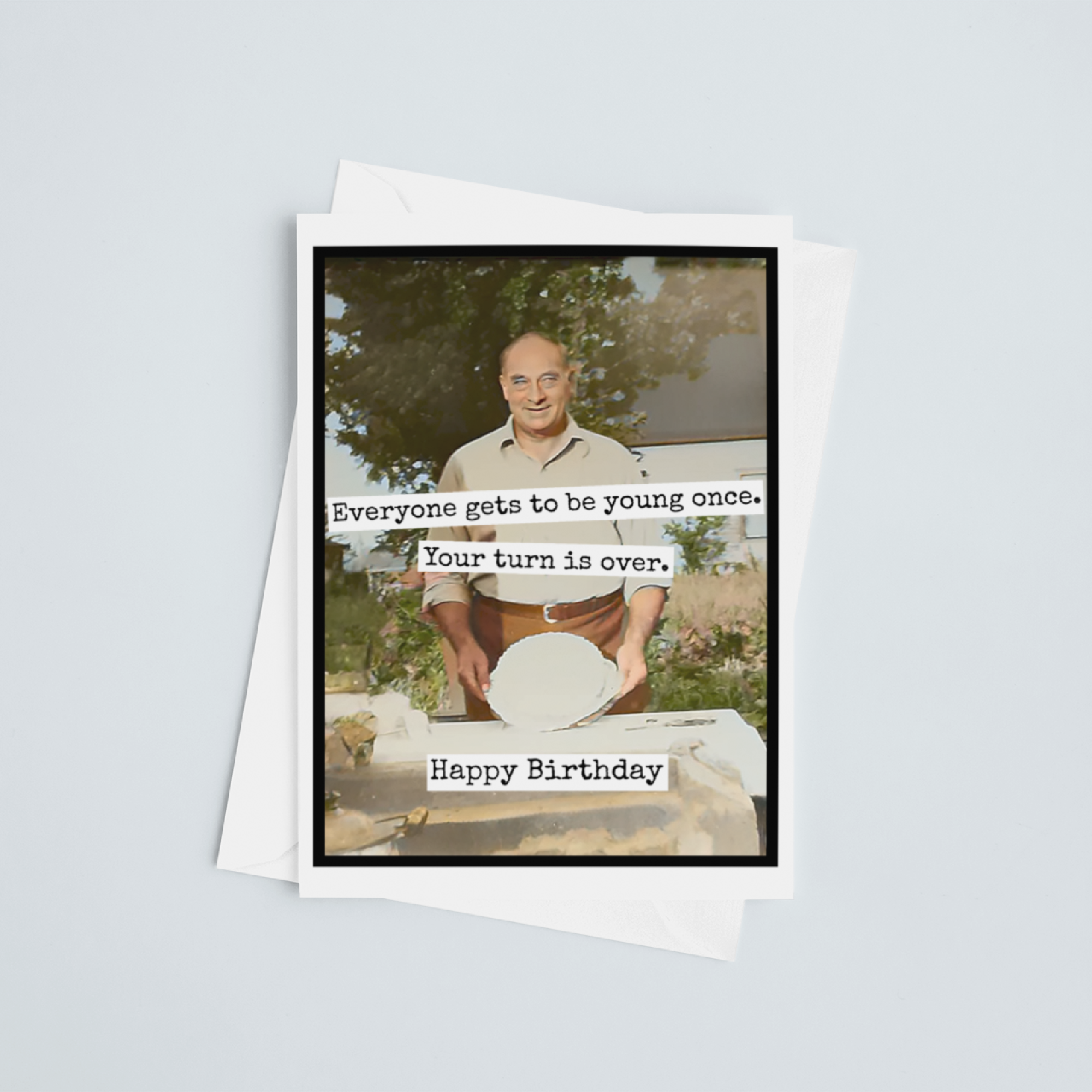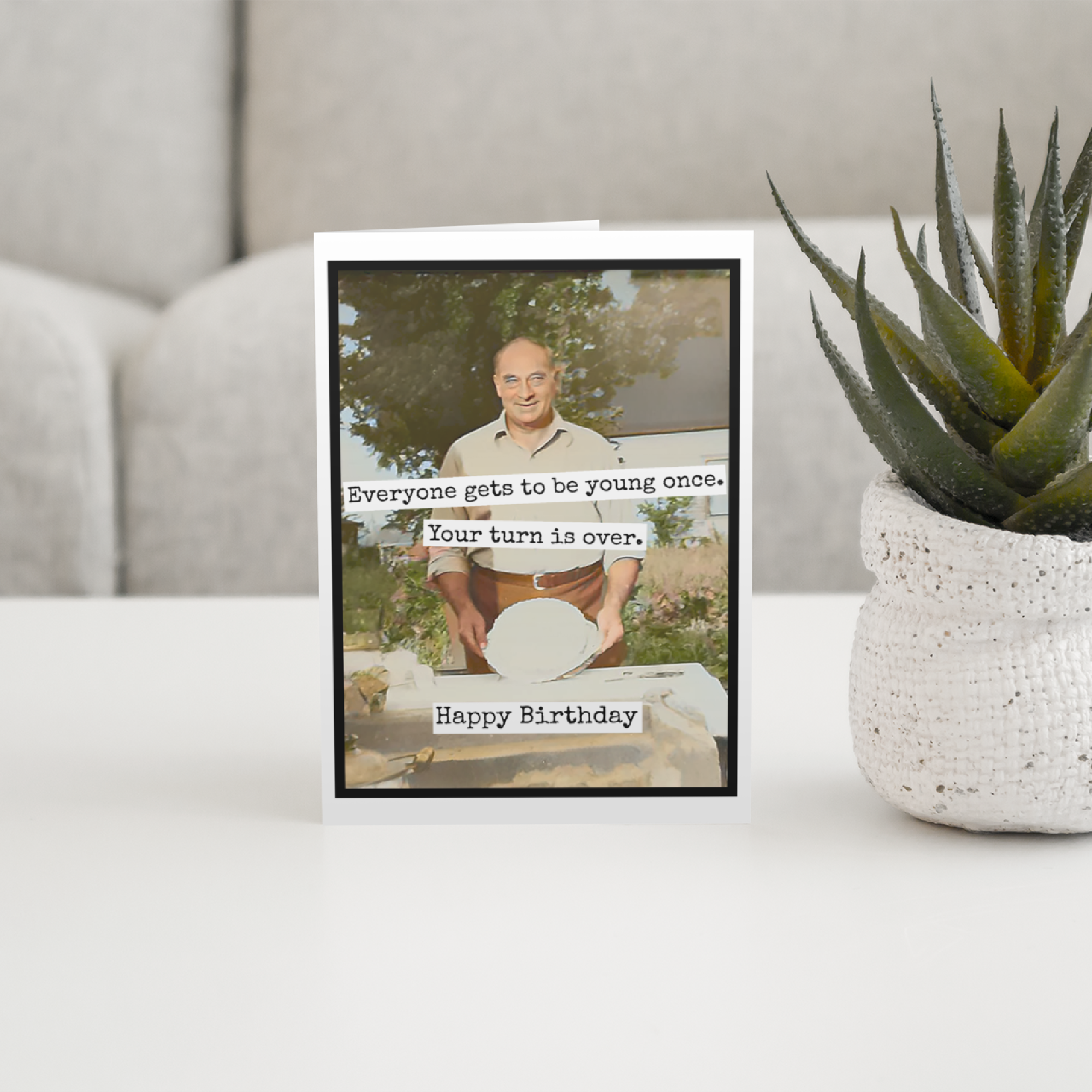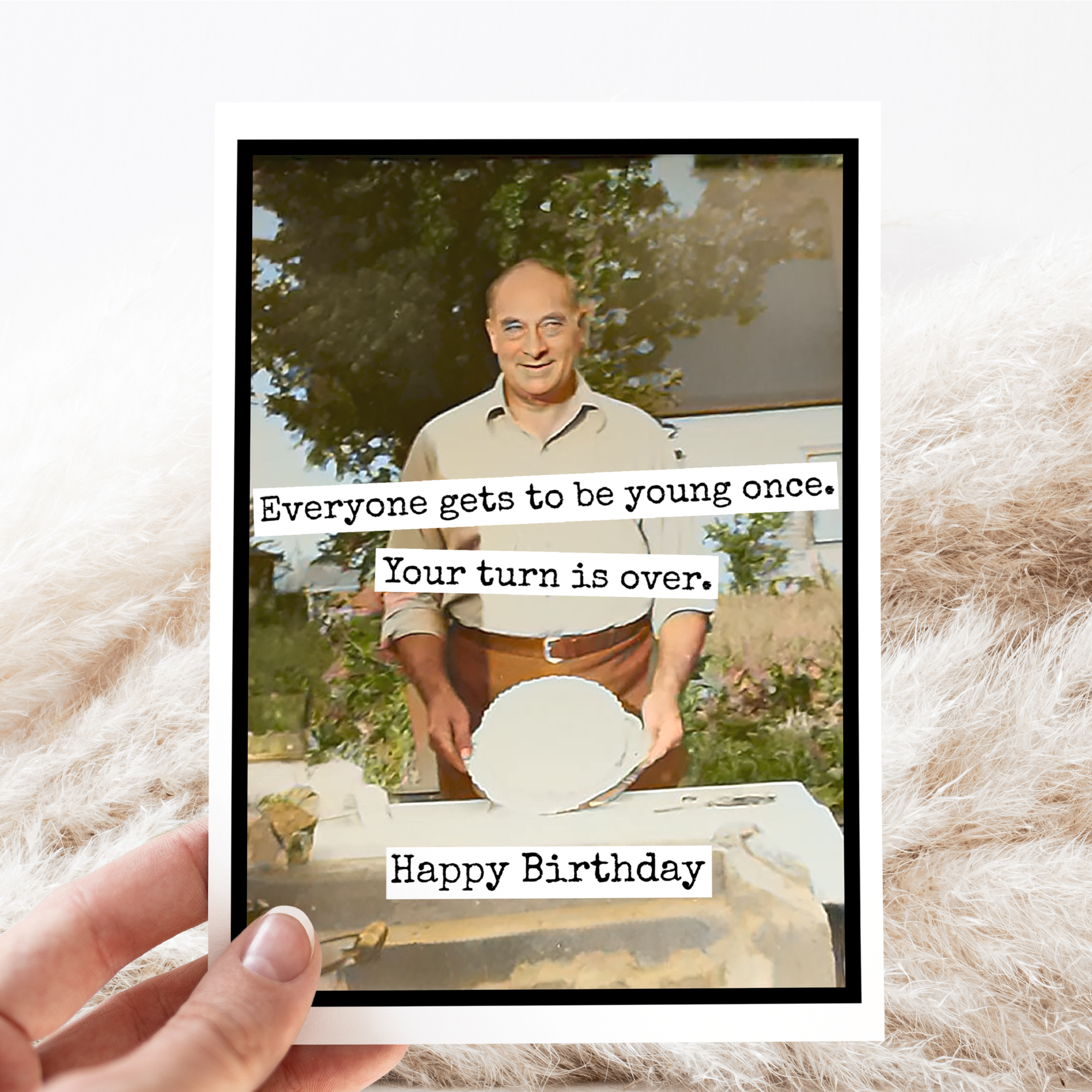 Raven's Rest Studio - Birthday Card. Your Turn Is Over. Vintage Photo Card for Man- Made in Canada